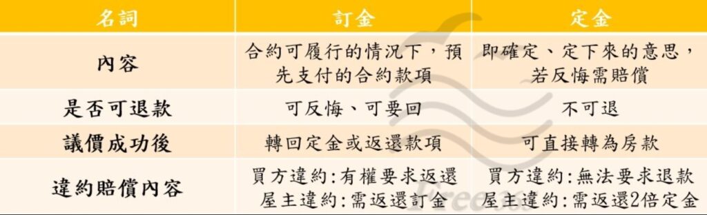 定金:定金意指如果賣方收了你的「定金」,但屋主(賣方)後來突然反悔不賣,對方除了要規還定金之外,還要賠你一倍的定金金額,這才是「定金」。