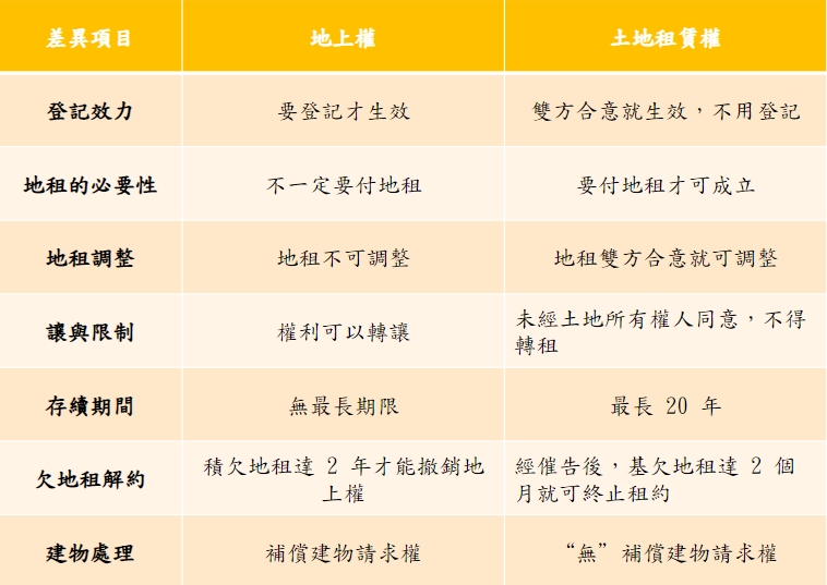 民法的地上權規定:《民法》第 832 條:「稱普通地上權者,謂以在他人土地之上下有建築物或其他工作物為目的而使用其土地之權」。