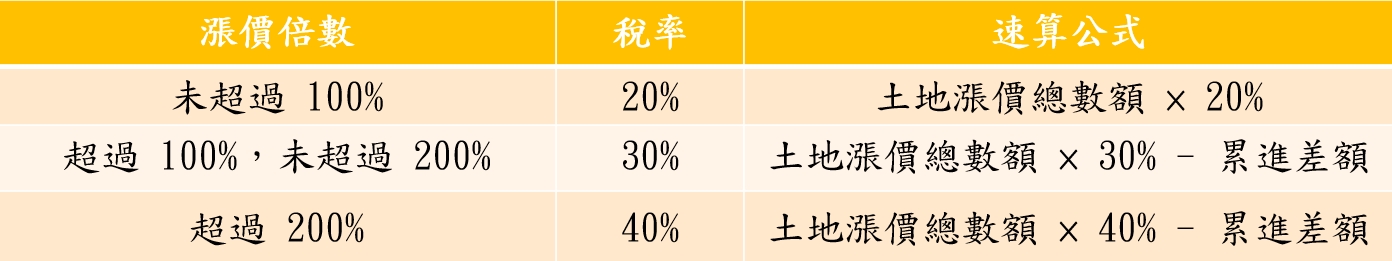適用於非自用住宅的土地,稅率依據土地漲價的倍數採累進課徵,分為三級: